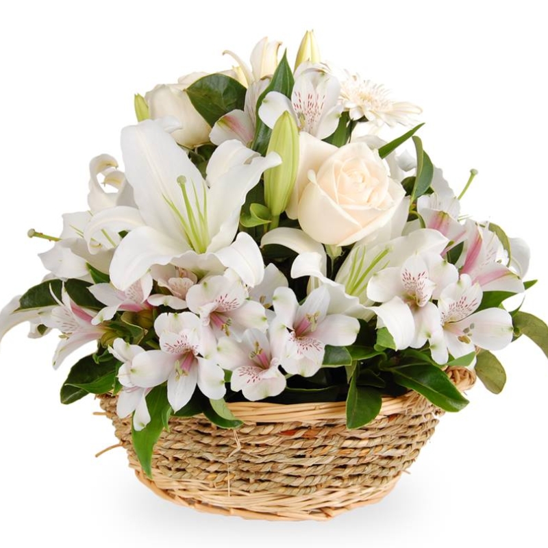 3 розы, 1 ветка белой лилии, 7 альстромерий, зелень, корзина, оазис.