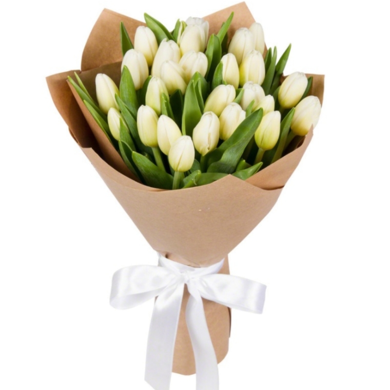 Букет состоит из 25 белых тюльпанов, крафт, атласная лента.