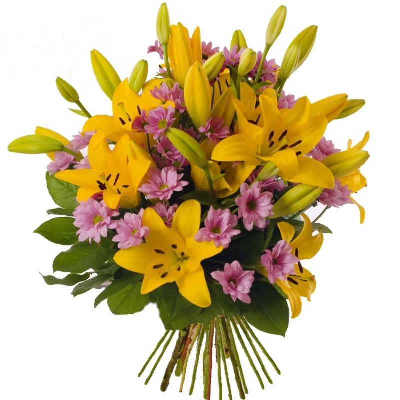 Букет состоит из 5 веток желтых лилии, 5 веток розовых хризантем, зелень, прозрачная упаковка, атласная лента.